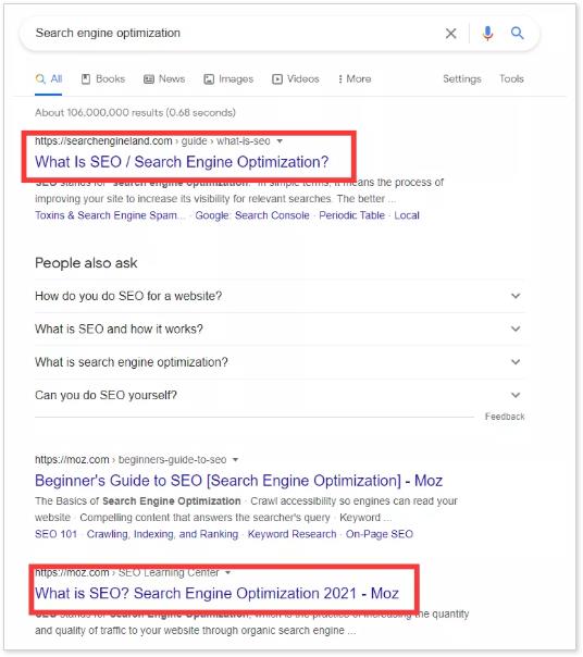 其实当我们搜索一个较为专业的名词的时候,首先会看到一到两个“X 是什么?”。比如搜索【搜索引擎优化】这个词,出现的就会是以下的情况,所以企业在创建新闻博客内容的时候,不妨把目标瞄准这个方向。
