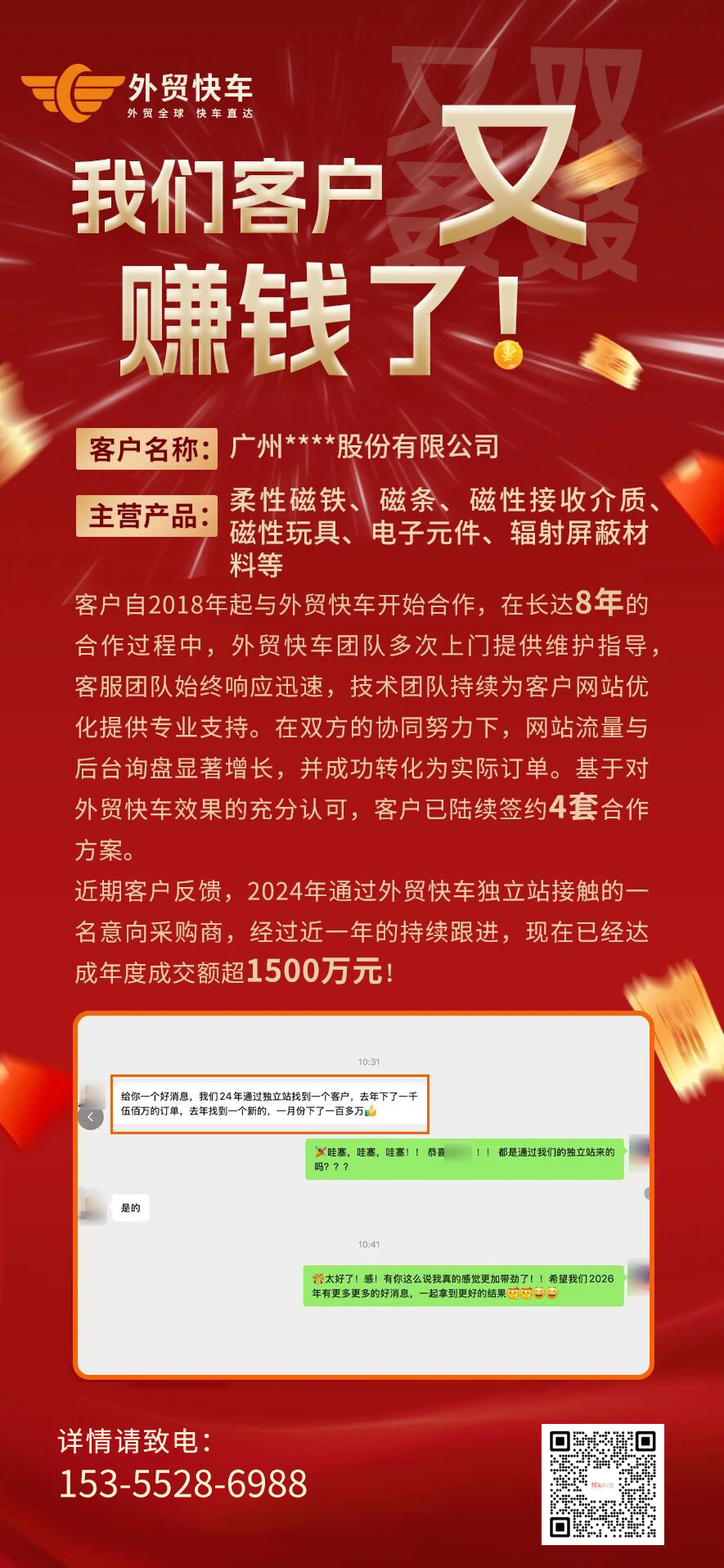 2017年,我了解到独立站模式对于外贸企业是一个很好的契机,通过多方对比我们选择了在行业内比较有优势地位的外贸快车,原因是外贸快车运营效果好,能够对我们的产品进行专业化、针对性的运营,让目标客户群体——国外采购商能够更好了解产品。从合作开始,外贸快车团队就提供了很多专业化的服务,从网站搭建、内容填充、页面布局到关键词设置、日常维护等都给了我们很多指导性建议,现在我们后台每日独立访问IP平均有150左右,月询盘量有120左右,这还不算直接发到邮箱的询盘。疫情期间还成交了多个几万到十几万美金不等的订单 。从2017年至今,我们布局独立站的策略成效逐渐凸显,网站达标数稳步增长,每日客户访问IP、排名也有了明显改善,收到的询盘也比较有针对性。同时我司每年出口额基本保持稳步增长,每年都会有新客户成交,公司的产品线、上下游产品也能得到补充。在2020年这特殊的一年,我们依托外贸快车把我们的产品“推出去”,最终公司并没有受到疫情太大影响,业绩仍然保持稳步增长,这是外贸快车带给我们的惊喜!